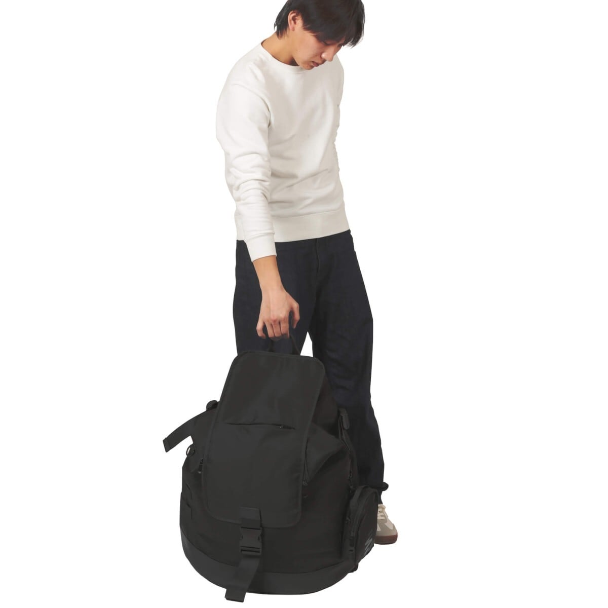 スタイリッシュなフォルムに加え、ショルダー周りの形状を工夫しクッション性能も充実。収納力も見た目以上でストレスフリーな使い心地。サイドには場面に応じて取り外して使えるミニショルダーバック付き。