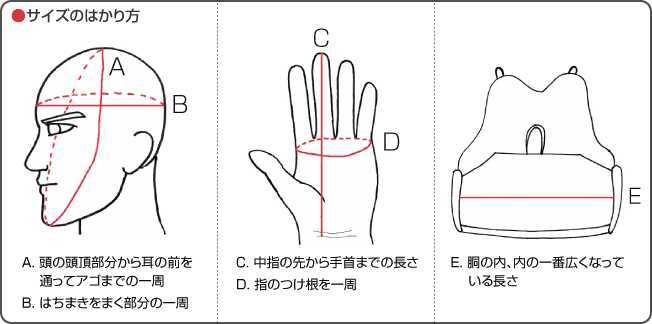 ※甲手の採寸 C=中指の先から手首までの長さ E=指の付け根を1周 ここではCの長さを元にサイズを標準的な大きさの目安をだしてみます。