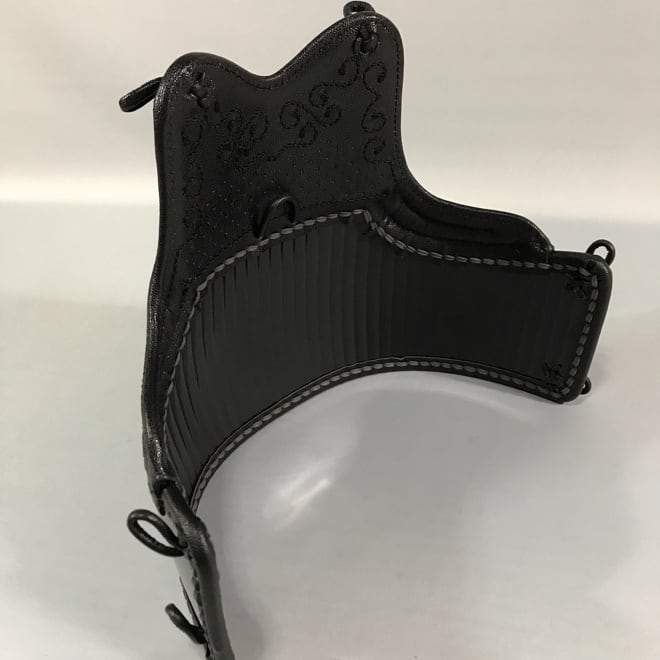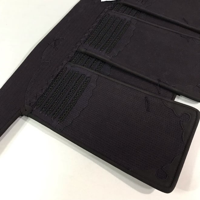 この防具は、刺し幅とピッチを変えることにより、実戦向きの軽量性と激しい稽古にも耐えうる堅牢性こ両立を目指しました。