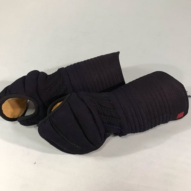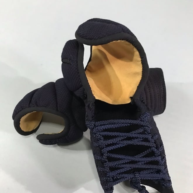 また、右甲手の布団を厚くして、激しい稽古から身体を守ります。甲手頭の表面には、段飾りを互い違いに入れる事で、より自然に握れる工夫も施しています。