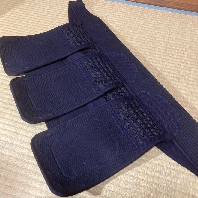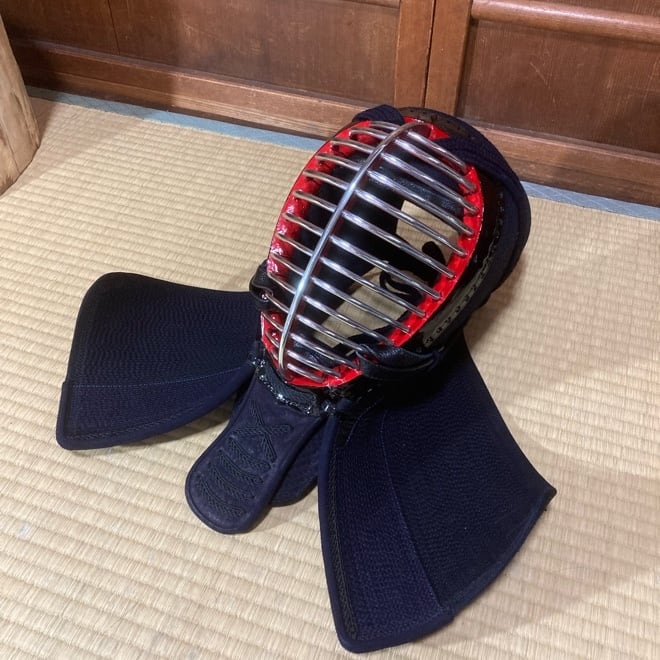 飾り糸、仕付け糸とも濃紺で、面金は軽量ジュラルミン、内輪木綿、面垂れ具の目刺し、袋仕立て、喉は×仕上げ鹿紺革